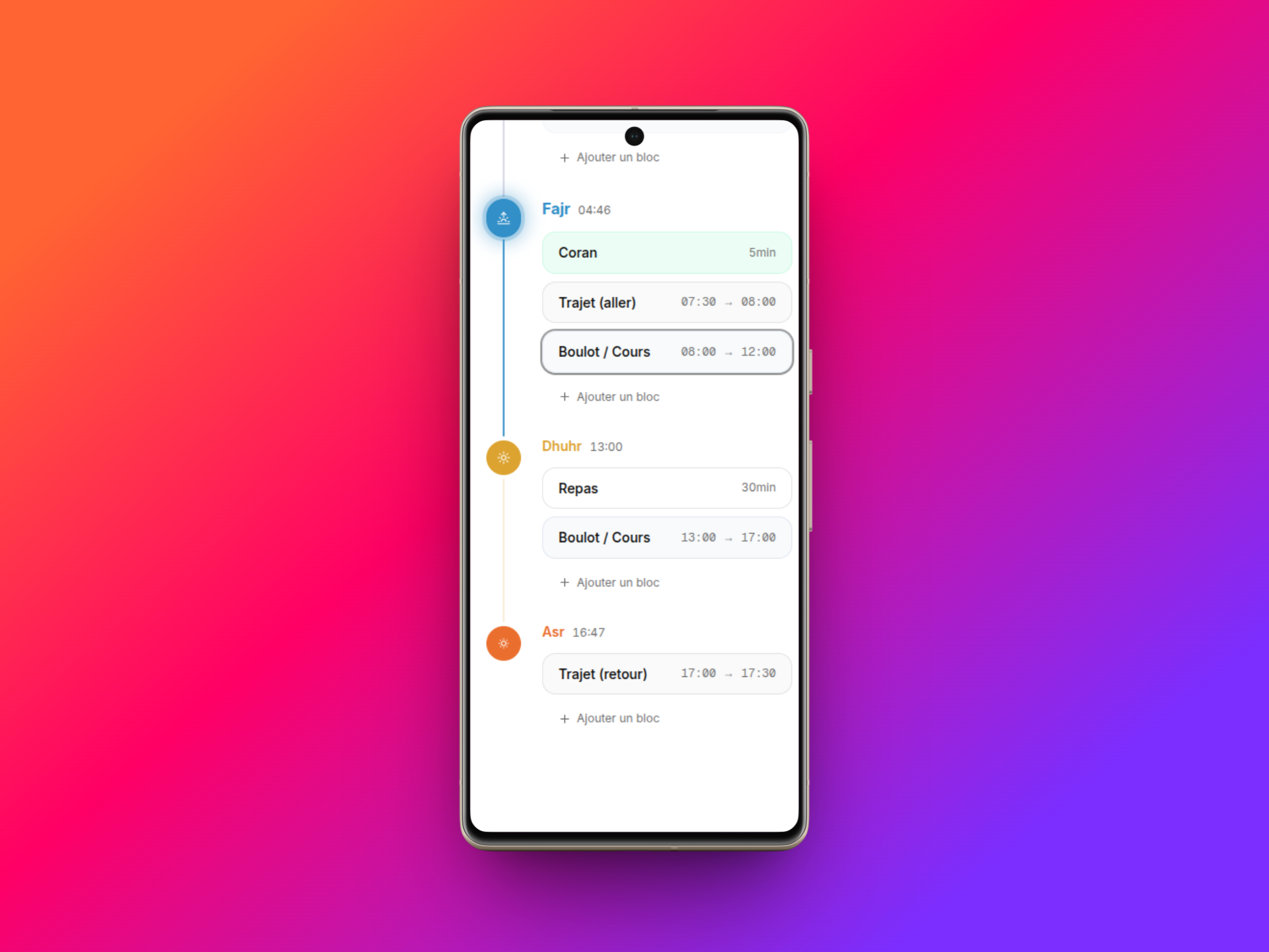 Application de planification de journée à partir de blocs de tâches qui s'organisent dynamiquement selon les heures de prière.