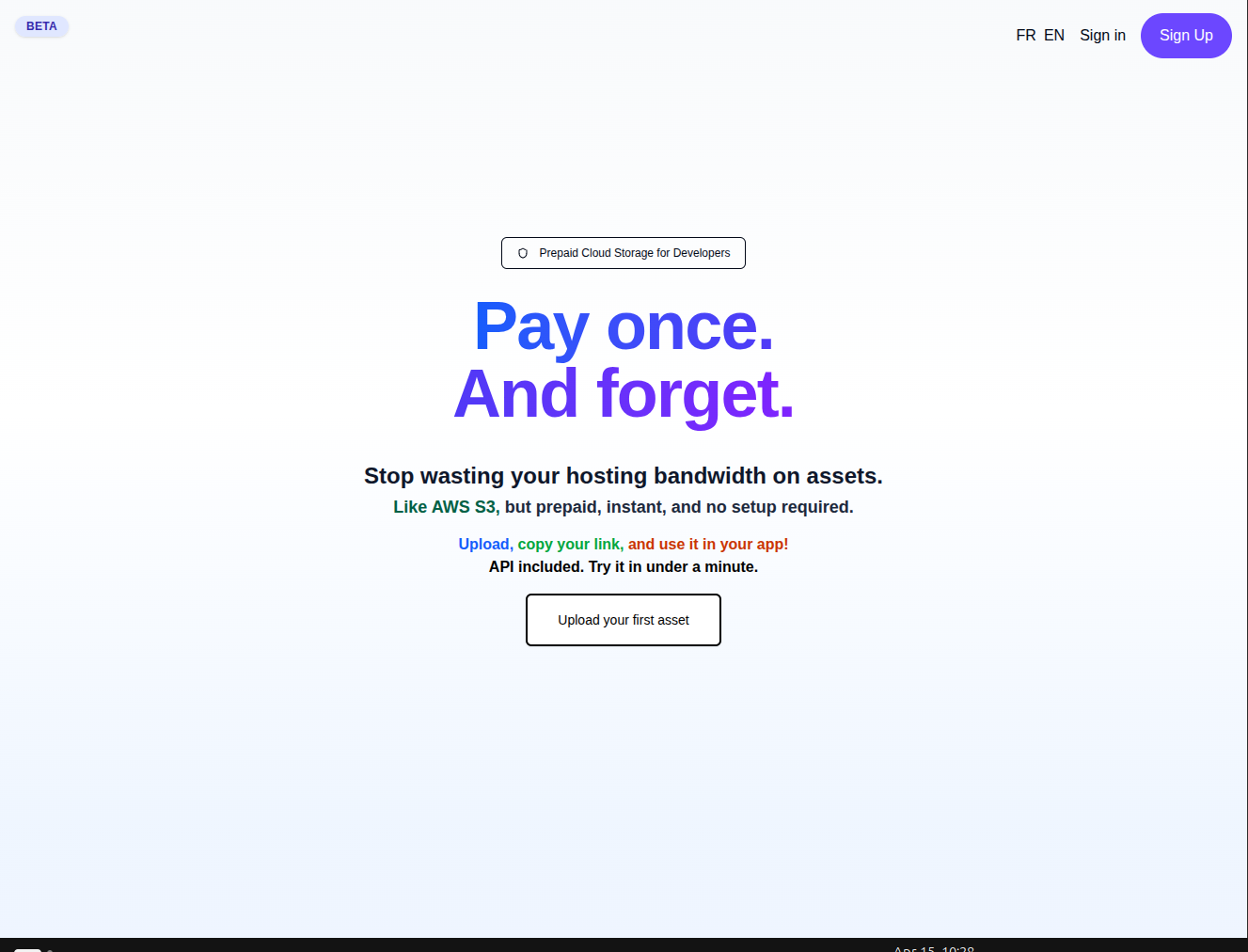 Service de stockage cloud prépayé, idéal pour les projets secondaires. Alternative à AWS S3 sans abonnement. Hébergement de fichiers avec URLs publiques, accessible via API et intégration Stripe.